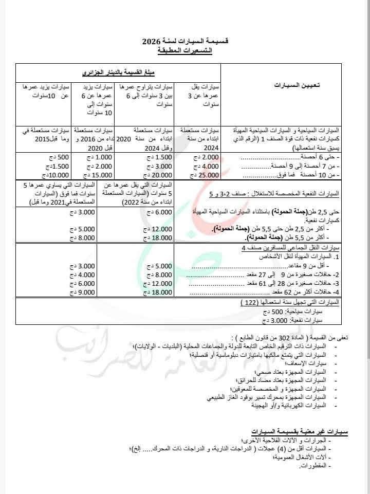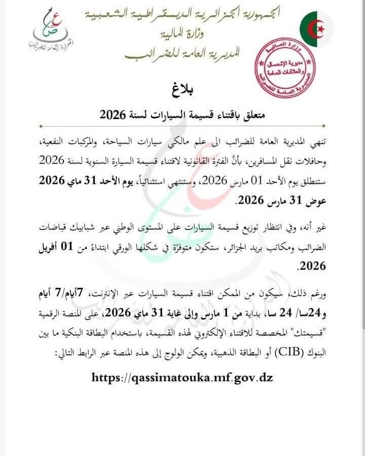 أعلنت المديرية العامة للضرائب إلى علم مالكي سيارات السياحة، والمركبات النفعية، وحافلات نقل المسافرين، بأنَّ الفترة القانونية لاقتناء قسيمة السيارة السنوية لسنة 2026 ستنطلق اليوم الأحد 1 مارس 2026، وستنتهي استثنائياً، يوم الأحد 31 ماي 2026 عوض 31 مارس 2026.