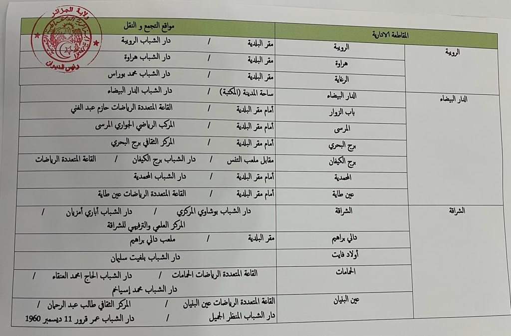 أعلنت مصالح ولاية الجزائر العاصمة، عن توفير وسائل النقل الجماعي المختلفة بصفة مجانية لنقل المواطنين الراغبين في متابعة الاستعراض العسكري الكبير، غدا الثلاثاء، انطلاقا من نقاط محددة من كل بلديات العاصمة ذهابا وايابا.