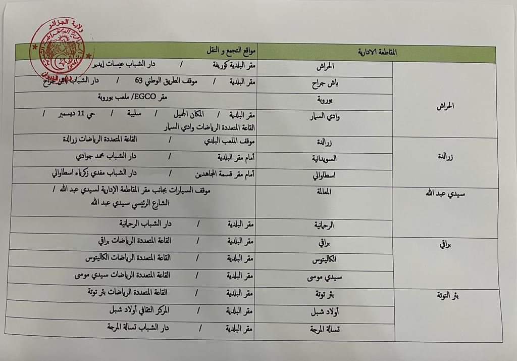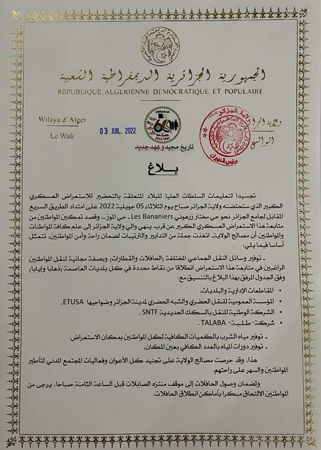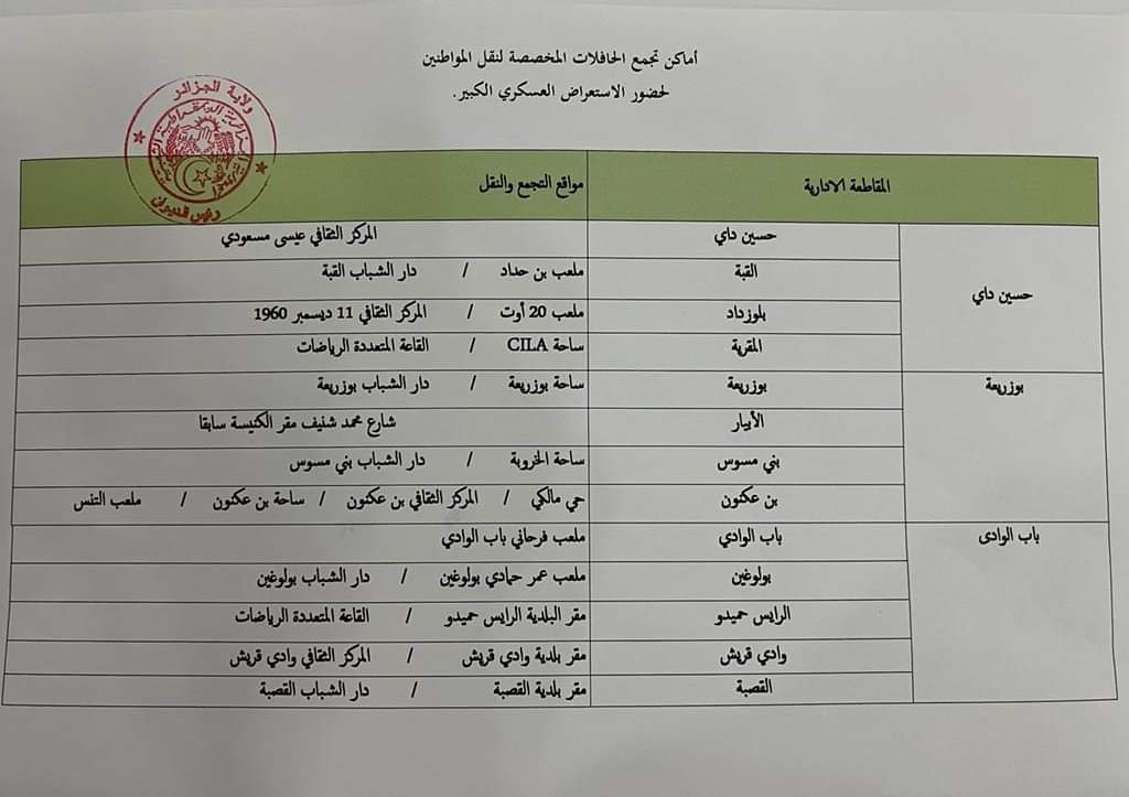 أعلنت مصالح ولاية الجزائر العاصمة، عن توفير وسائل النقل الجماعي المختلفة بصفة مجانية لنقل المواطنين الراغبين في متابعة الاستعراض العسكري الكبير، غدا الثلاثاء، انطلاقا من نقاط محددة من كل بلديات العاصمة ذهابا وايابا.