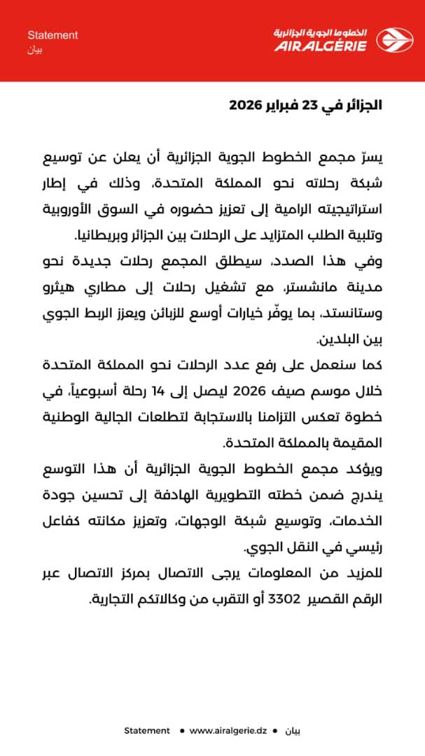 À compter de la saison estivale 2026, la compagnie portera à 14 le nombre de vols hebdomadaires vers le Royaume-Uni. Cette montée en puissance répond à plusieurs objectifs : faciliter les déplacements de la communauté algérienne installée outre-Manche, offrir davantage de flexibilité aux passagers et renforcer les échanges économiques et culturels entre les deux pays.